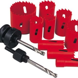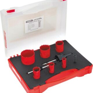 Comprises of 22, 29, 35, 44, 51 and 64mm variable pitch bi-metal high speed steel holesaws with hardened cutting edges, K7 spring, K4 and K10 arbors with pilot drills.