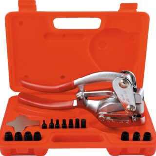 Adjustable depth gauge. Suitable for materials up to 14 gauge. Die and punch sizes: 2.38, 3.18, 3.97, 4.76, 5.56, 6.35, & 7.14mm. (3/32″, 1/8″, 5/32″, 3/16″, 7/32″, 1/4″ & 9/32″)