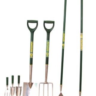 Hand trowel, weeding fork and bulb planter, digging spade and fork. Garden rake and dutch hoe both with stainless steel heads, steel handles and PVC grips. Bypass secateurs – maximum cutting diameter 25mm. Heavy duty polythene garden bag with 170ltr capacity. Heavy duty Canadian rigger gloves size 10.