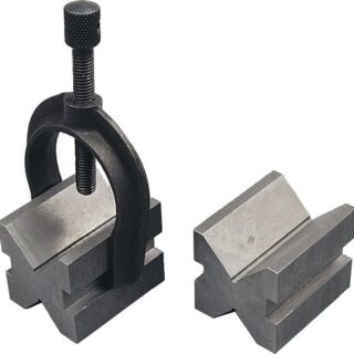 Designed for checking precision machine parts. Hardened and precision ground steel supplied in matched pairs, each with V-grooves central and parallel to the sides and base ensuring perfect alignment. Complete set with two V-blocks (one pair) and two clamps.
