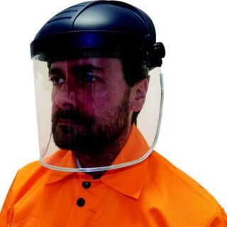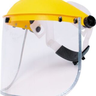 Replaceable one-piece clear polycarbonate lens which protects against chemical splashes, lens also has an aluminium edge. Built-in foam sweatband with a variable setting on the crown support and a ratchet controlled headband adjuster with a pivoting full face and brow protection. Medium energy impact protection Class 1.