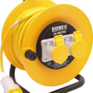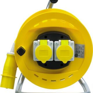 Twin socket 240V open drum industrial cable reel. Metal frame with built-in carry handle with winding handle built into the high impact resistant drum. Rated: 3120W/13A unwound. 1680W/7A wound. 25m cable supplied complete with fitted plug. Conforms to BS 1363 and BS EN61242:2004.
