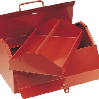 Manufactured from industrial quality steel with all welded construction. Durable corrosion-resistant two-part epoxy powder coat finish. Two piece cantilever lids with padlock hole for additional security. Large base compartment with four partitioned, instant access cantilever trays for additional storage. Full width carry handle also automatically closes trays when lifting.