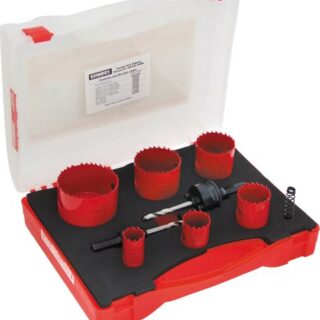 Comprises of 22, 29, 35, 44, 51 and 64mm variable pitch bi-metal high speed steel holesaws with hardened cutting edges, K7 spring, K4 and K10 arbors with pilot drills.