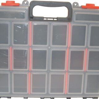 Suitable for transporting and storing smaller items. Manufactured from hi-density industrial strength plastic with opaque lid for viewing contents. Slide clasp-locking mechanism to prevent opening while in transit/storage. Lid and base feature two aligning padlock holes to accept padlocks with shackle diameters up to 5.8mm. The lids have three hinges for strength and durability. Eight fixed compartments supplied with dividers to make up to 16 sections.