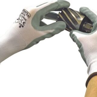 Grey nitrile foam coating on a 13 gauge seamless knitted white nylon liner with knitted elasticated cuffs. Nitrile coating to palms and fingertips, provides excellent dexterity with precise grip.