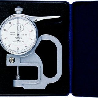 For quickly measuring the thickness of paper, film, leather, rubber etc. The spindle is moved using the thumb lever. With adjustable bezel. Measuring faces are made of high grade tool steel, hardened, ground and lapped for accuracy. Thumb lever raises spindle to allow for workpiece insertion.